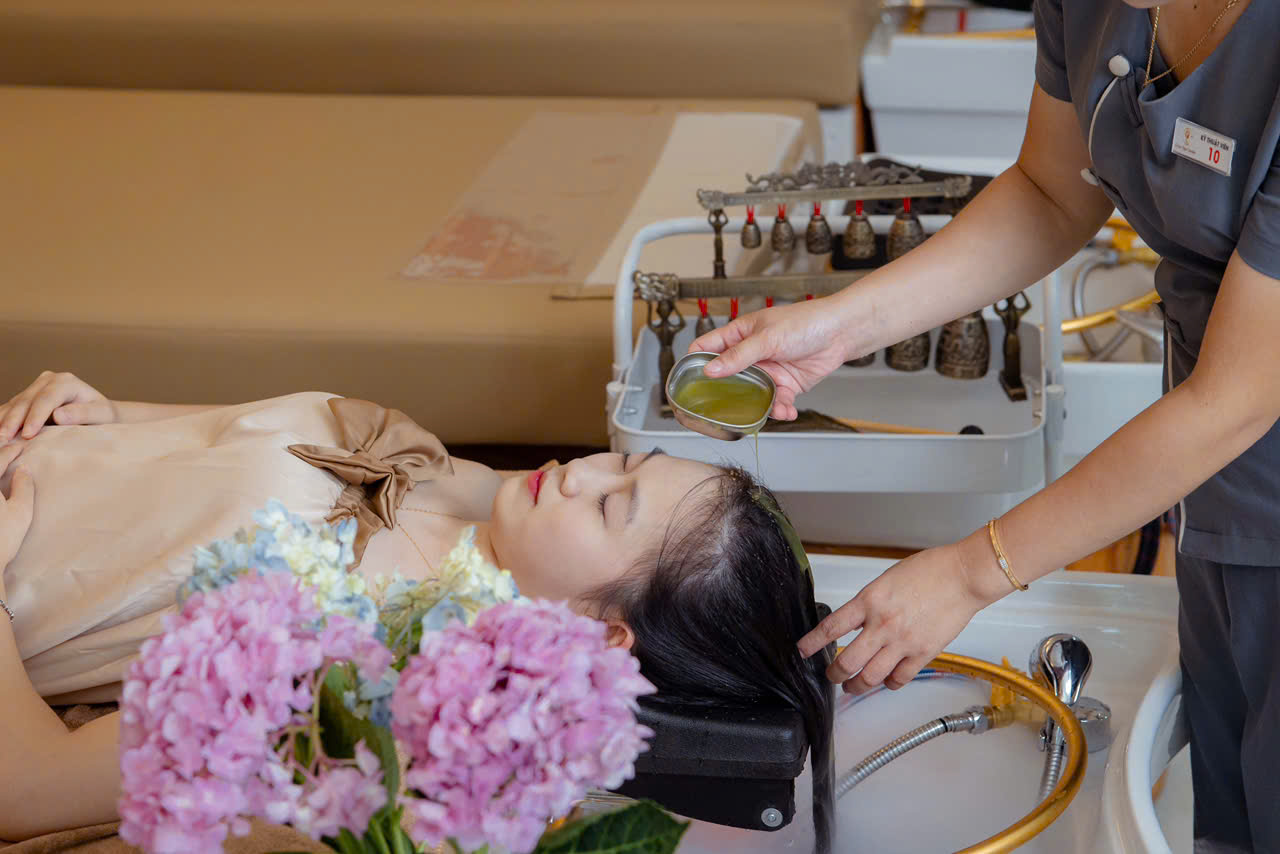 * Cuối cùng sẽ xả sạch đầu và tóc bằng nước lá thảo mộc